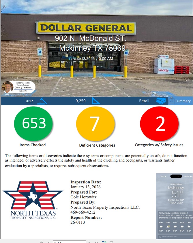 At North Texas Property Inspections, LLC, we are centrally located in Dallas Ft. Worth to best serve all your commercial property inspection needs. We have over 45 years of combined experience providing extensive and professional computerized reports.